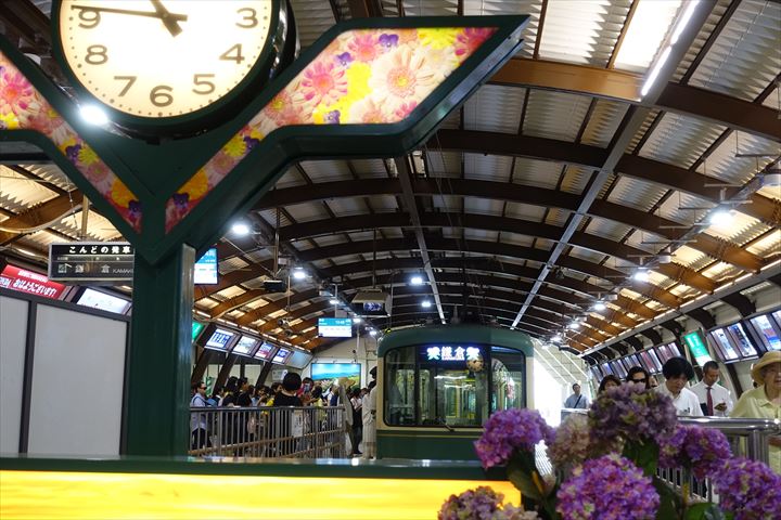 江ノ電の方面の文字の横にアジサイ。
